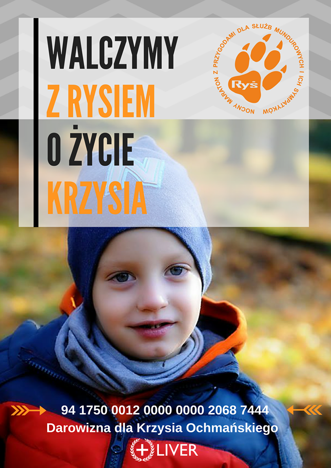 Trudno jest wyobrazić sobie sytuację, w której wyprzedaje się dosłownie wszystko, by kupić jedno opakowanie leku. Wszystko to, by móc zatrzymać życie Krzysia. Walczą o to każdego dnia jego rodzice, dziadkowie, przyjaciele i Stowarzyszenie Liver. Teraz do naszej drużyny dołącza ekipa RYSIA – Nocnego Maratonu z Przygodami dla Służb Mundurowych i ich Sympatyków. Mając takie wsparcie nie można przestać walczyć. Robimy też co w naszej mocy, żeby zwrócić uwagę Ministerstwa Zdrowia na sytuację chorych cierpiących na rzadkie choroby. W trakcie imprezy będzie można podpisać petycję o refundację leku Zavesca w Polsce i szansę chorych na to, by powstrzymać objawy choroby Niemanna–Picka.”